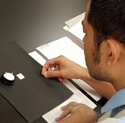 性状色見本を現場で活用しての感想 色を少しずつ変化させた色パッチを縦横に多数配列した色見本と試料とを見比べることにより、どの位置の色パッチに近いかを、容易に選択できるようになりました。周囲の色の影響を受けないように、自社で黒いマスクを作製して見比べています。