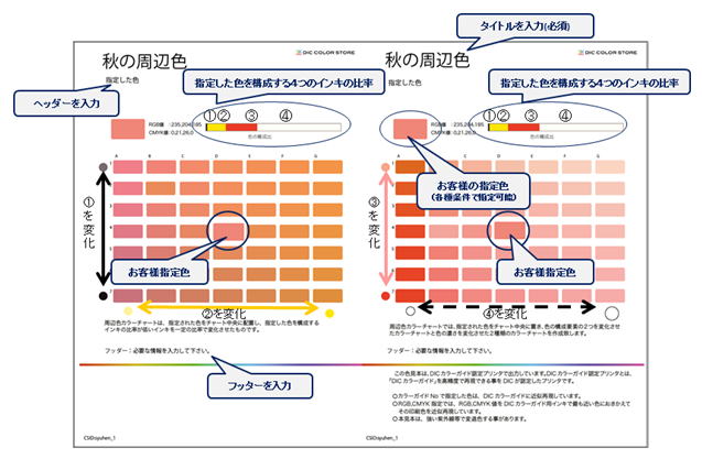 周辺色色見本は、お客様が指定された色を中心に配置し、指定した色を構成するインキの比率を変化させた2種類のカラーチャートです。